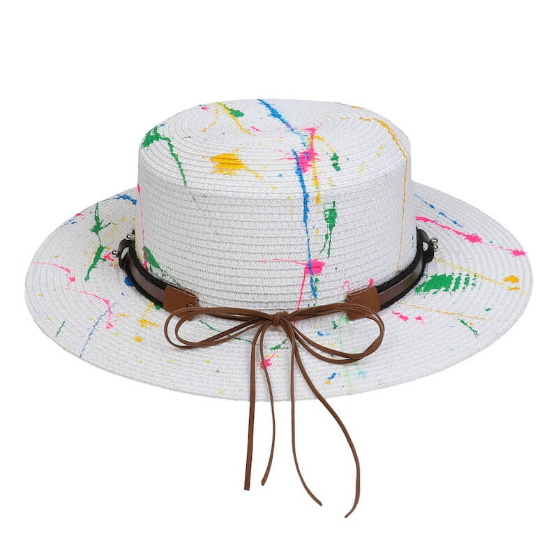 Questo cappello di paglia di fedora dipinto fatto a mano costruito in paglia di carta 100%, Questo cappello presenta un bordo largo piatto e puoi sceglierlo con la cintura personalizzata come banda di cappelli attorno al cappello.