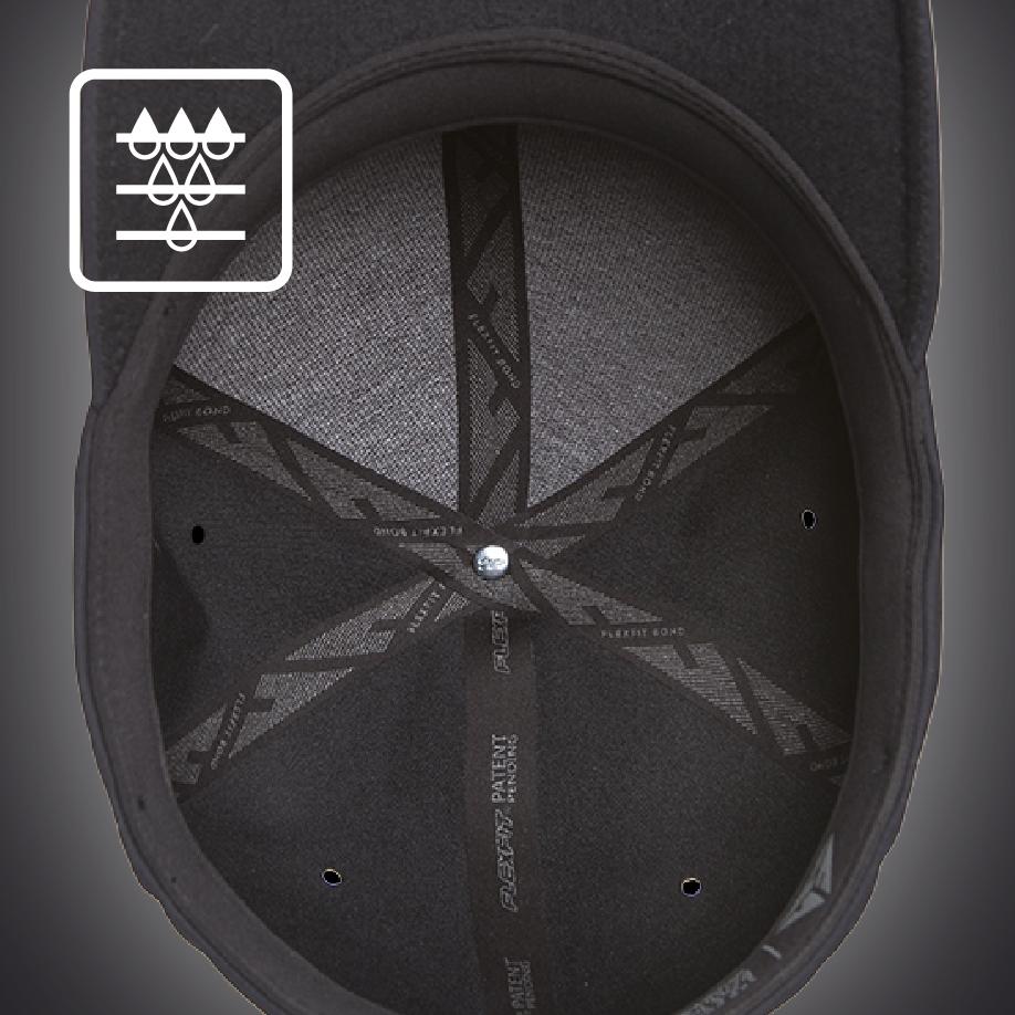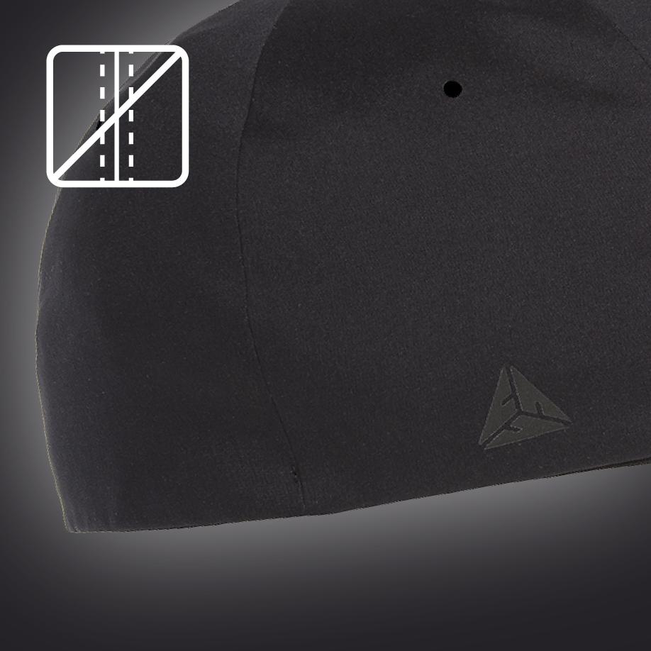 seamless panels 92% poliester, 8% spandex; 6-płyta, structured hard buckram backed front panels, mid-profile; 3-1/2inch crown; laser cut eyelet; spandex sweatband retains shape; 3 layer sweatband prevents stain, moisture wicking, cloud cushion for comfort; inside taping is thermal regulating